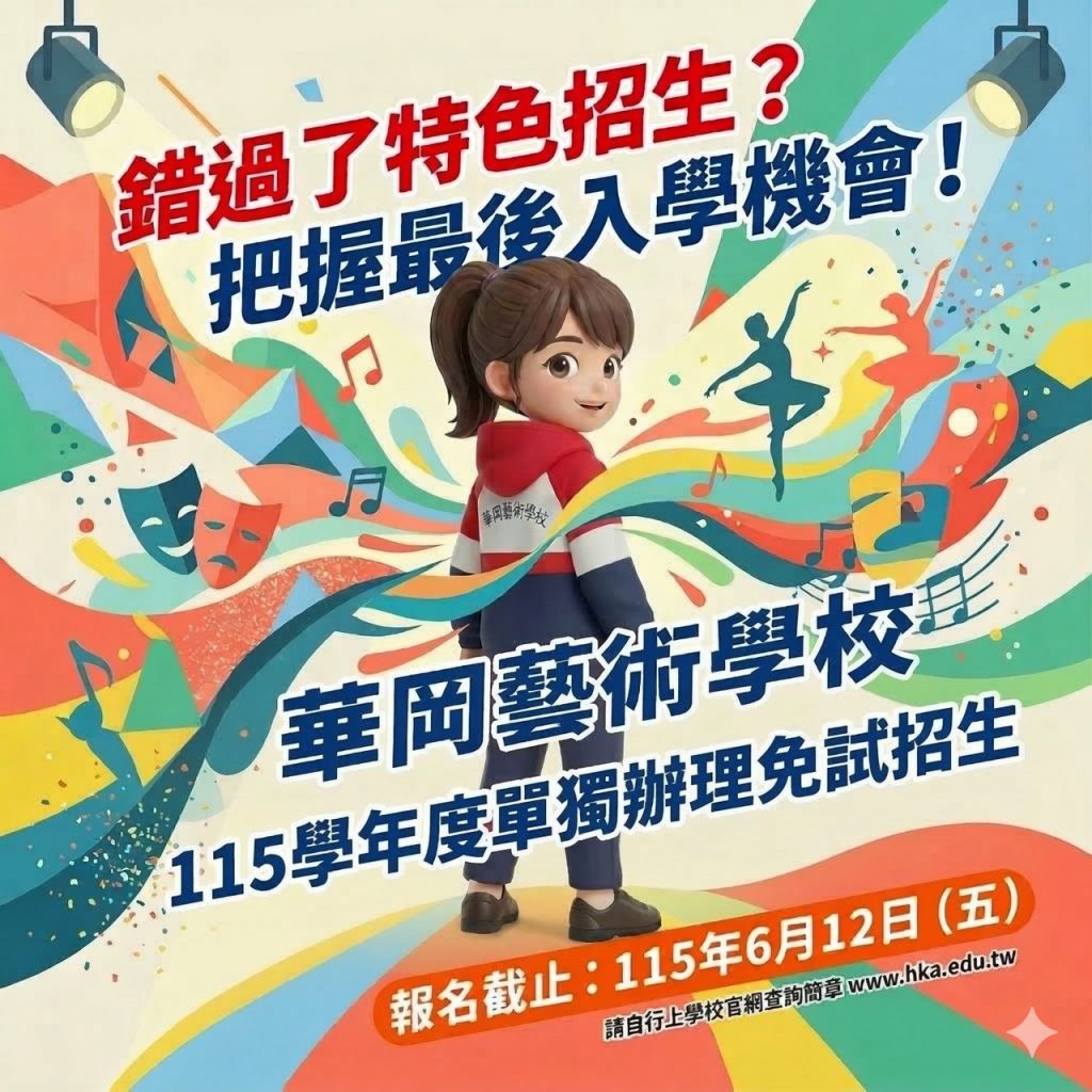 | [115.01.15] | 臺北市私立華岡藝術學校115學年度單獨辦理免試招生【簡章】公告(PDF)(NEW) |